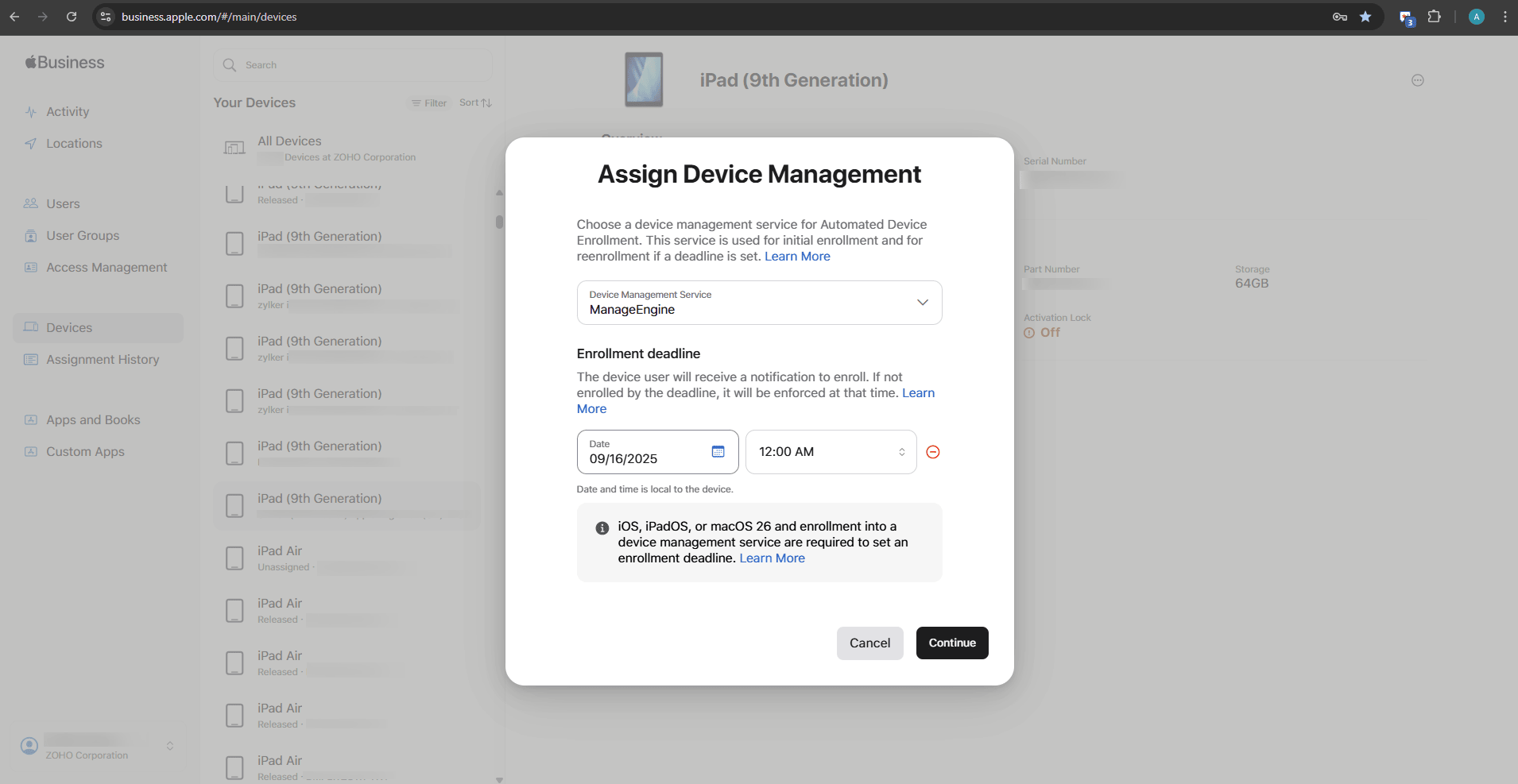 - Verify enrollment in ManageEngine MDM. The migration deadline configured by the admin becomes visible in the ManageEngine MDM console once the device receives the migration assignment.