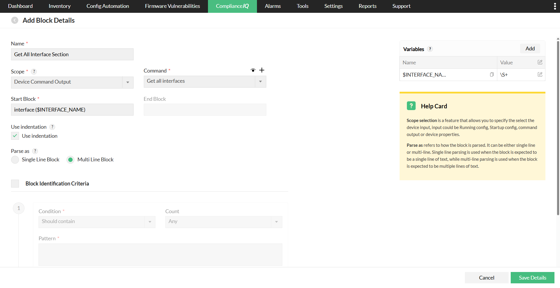 This is an optional component. The Block Identification narrows the Condition to specific sections of the configuration. It identifies and extracts relevant sections based on start and end markers, indentation, or parsing rules without performing validation itself. When a start block and an end block are defined to identify a configuration block, the block identification criteria can be applied to run conditions only within the matched block, allowing further filtering of the configuration. By isolating these blocks, subsequent checks are more targeted and efficient.