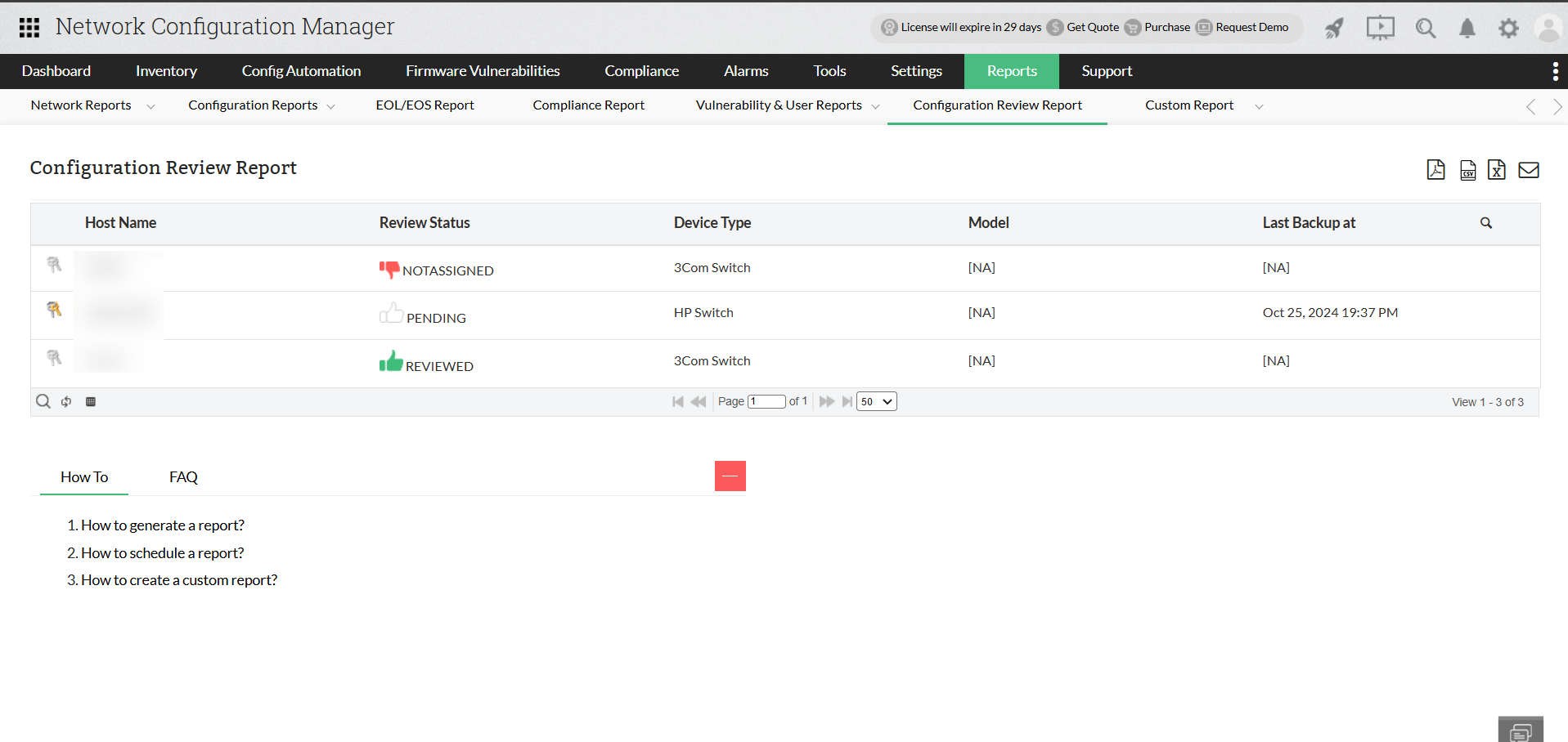 The report includes key details such as the device host name, review status, device type, and the timestamp of the last configuration backup.