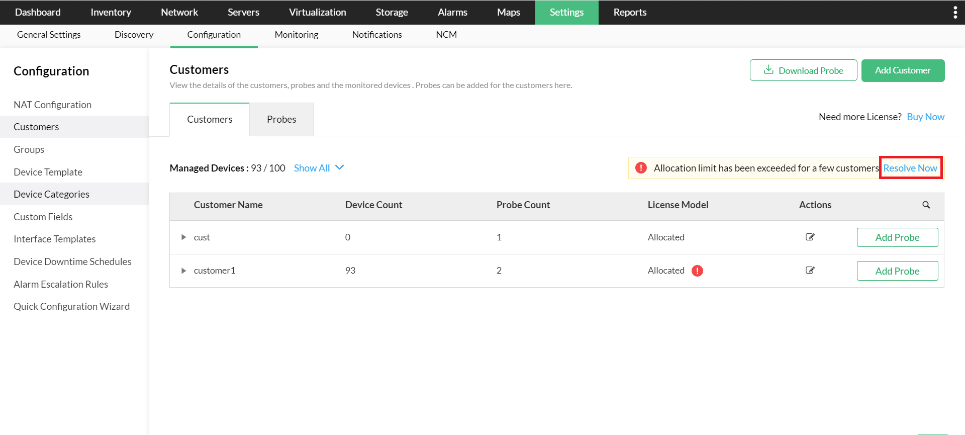 If the customer has exceeded the license limit, OpManager MSP will notify the customer via the notification icon and emails. If the license limit is exceeded, they can reallocate the resources or they can contact a MSP administrator to increase the allocated license limit.