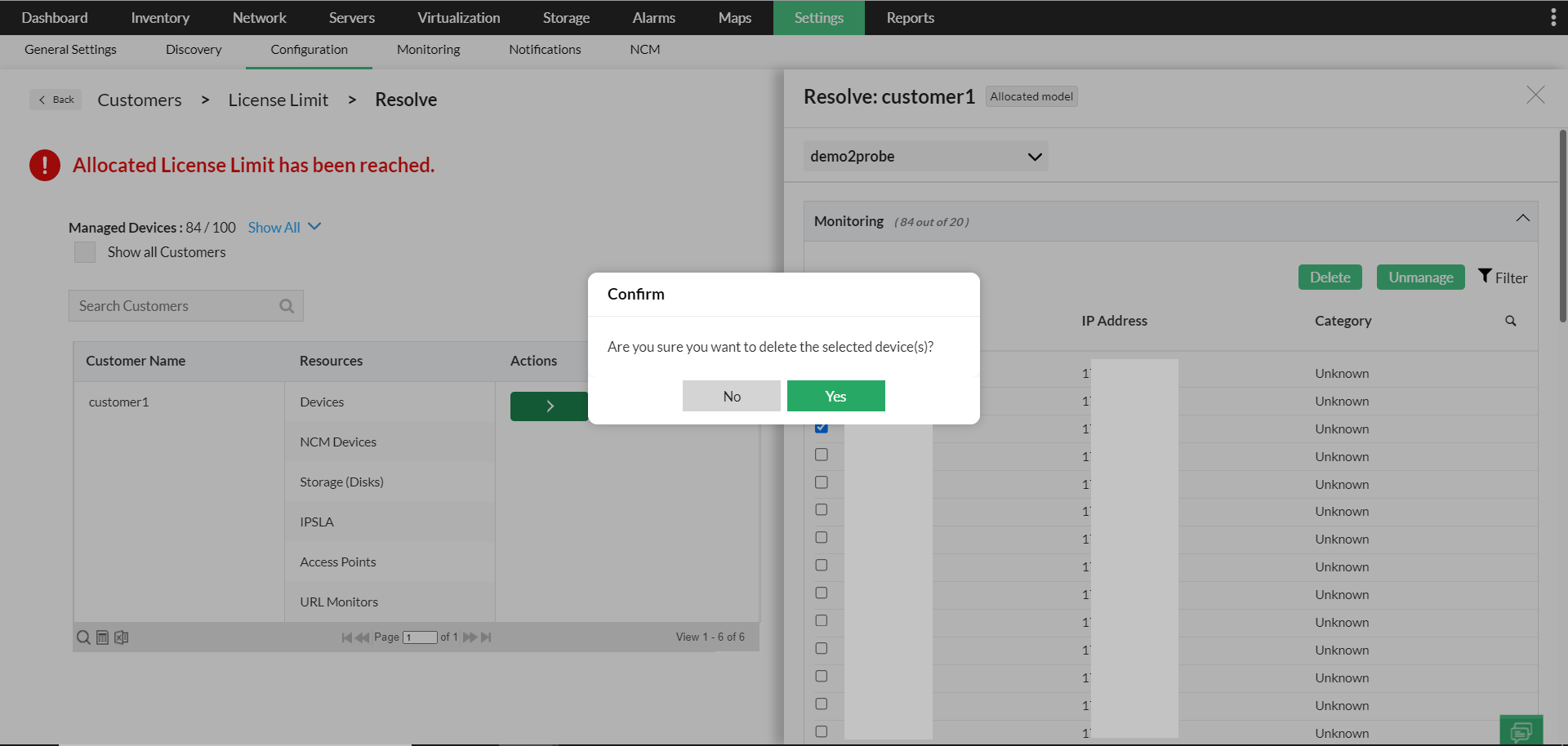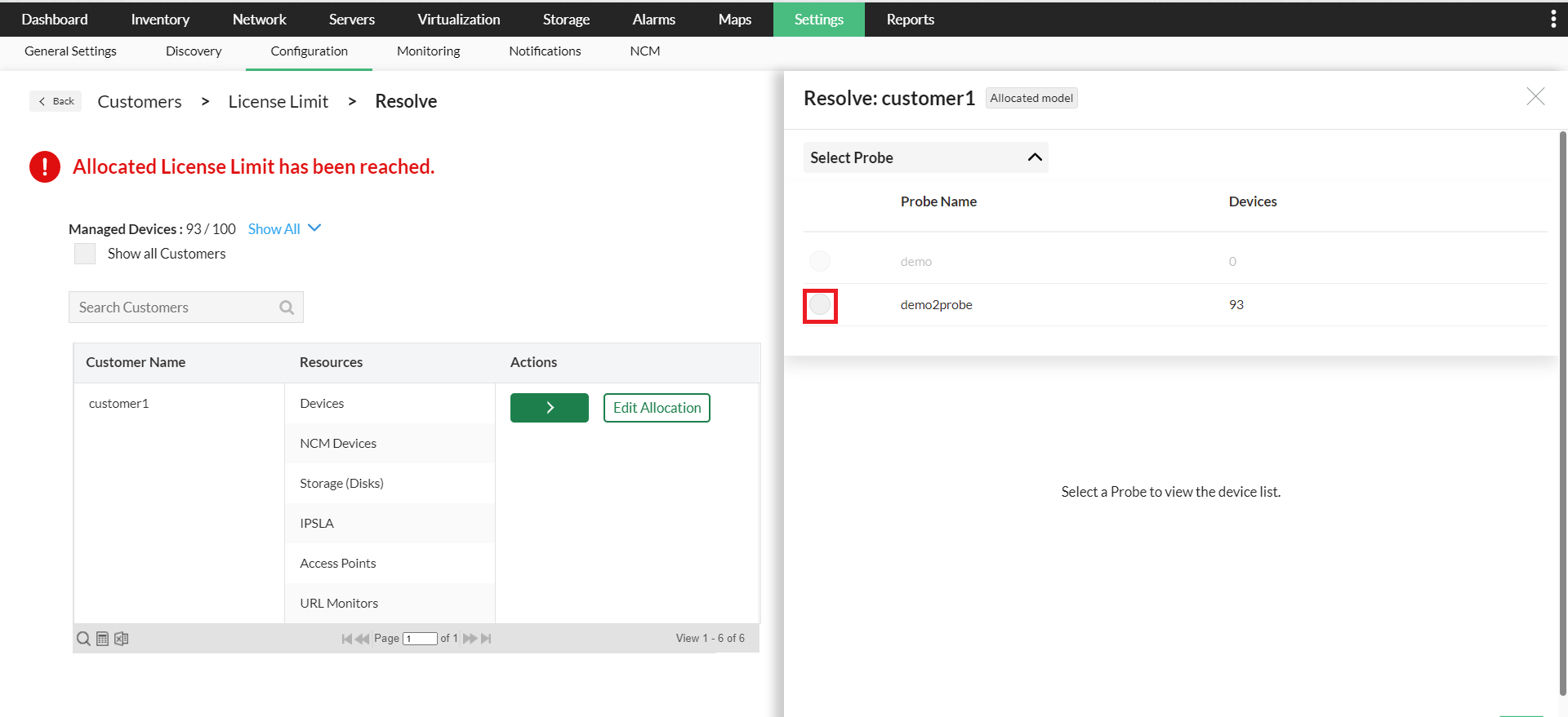 - The list of probes used by the customer will be displayed. Select a probe which exceeds the license limit.