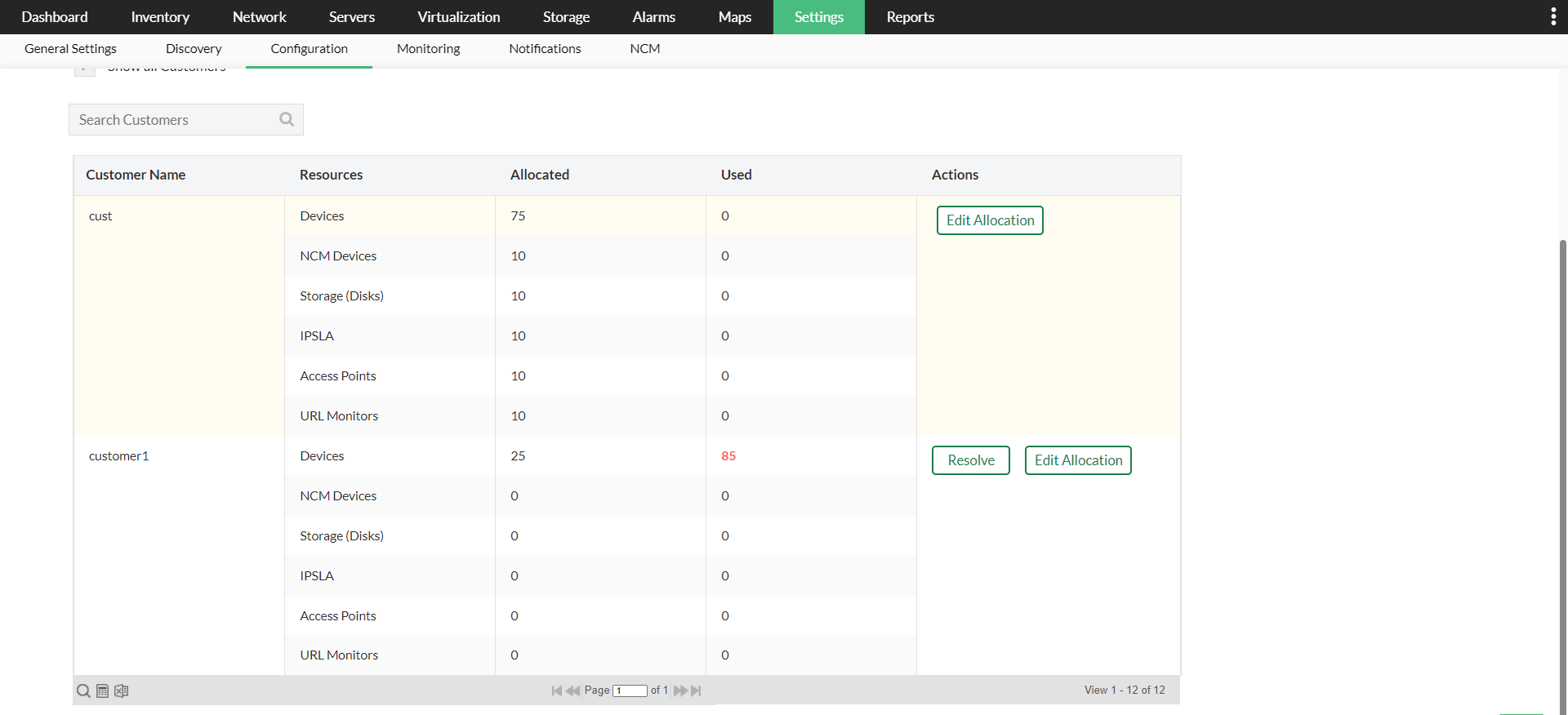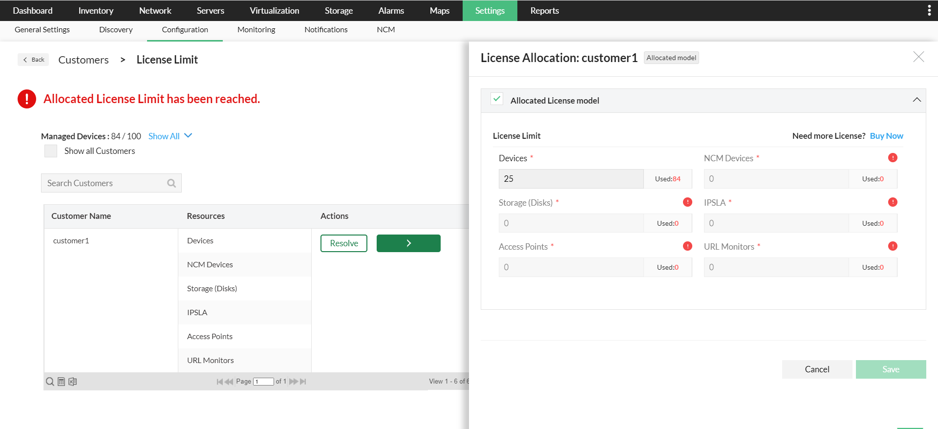OpManager MSP has customer based license allocation now, which will enable a MSP administrator to allocate licenses to customers. The MSP administrator can set a license limit for the resources in the customer's network infrastructure. With OpManager MSP's license allocation model, you can set a license limit for the following resources,