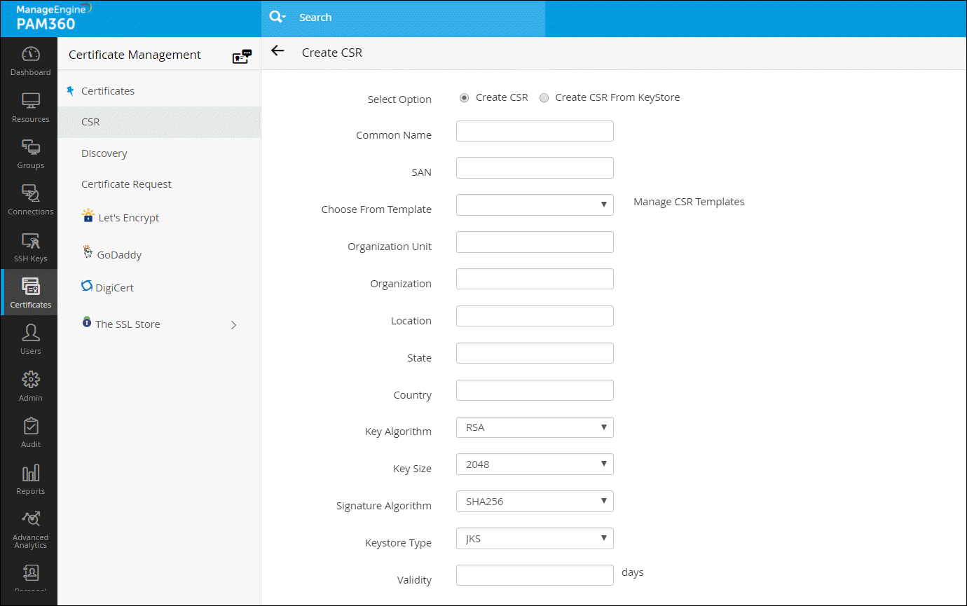 PAM360 facilitates certificate deployment through which you can deploy certificates from its repository to target server's Microsoft Certificate Store.