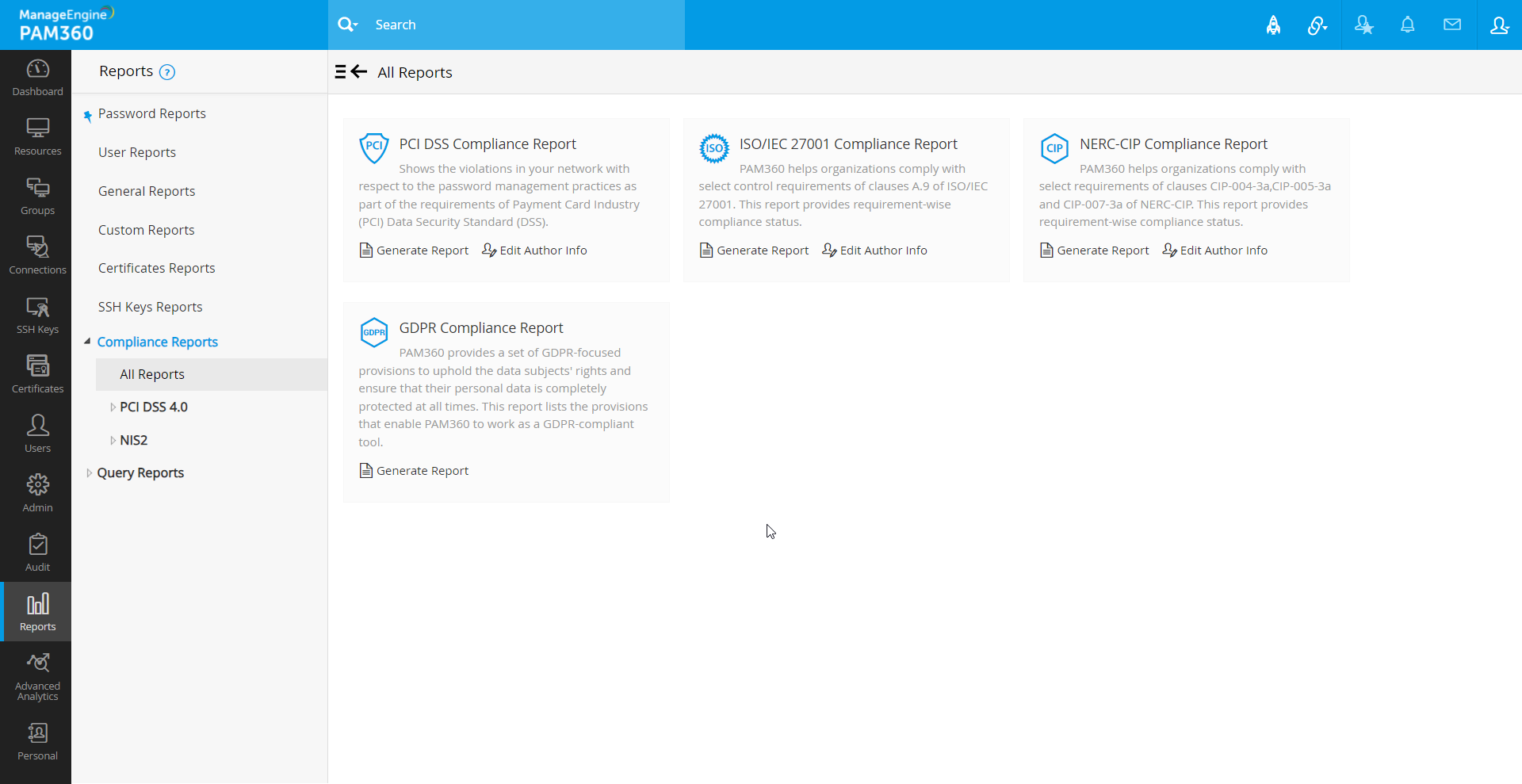 PAM360 provides about fourteen canned reports classified under four types. In addition, there is provision to create custom reports.