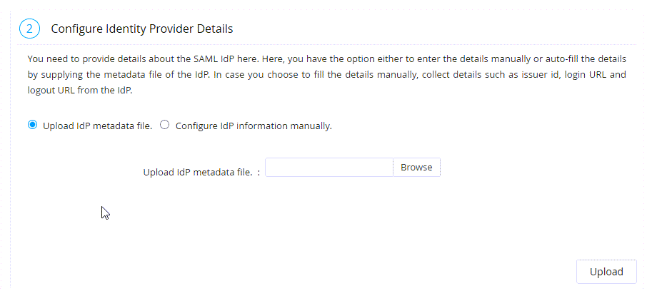 - After selecting the IdP file from your machine, click the Upload button at the bottom of the section to successfully configure the IdP details.