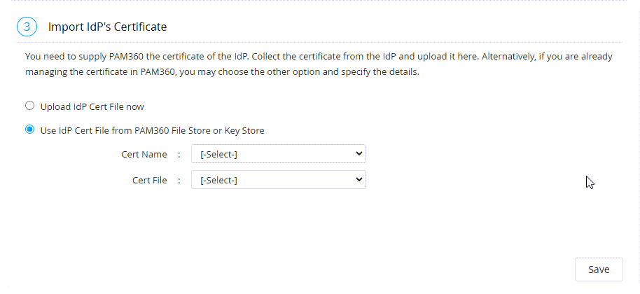 - Use IdP Cert File from PAM360 File Store or Key Store - Choose this radio button if you have the certificate stored in your PAM360 account. Select the respective file store resource and account on the Cert Name and Cert File fields and click Save.