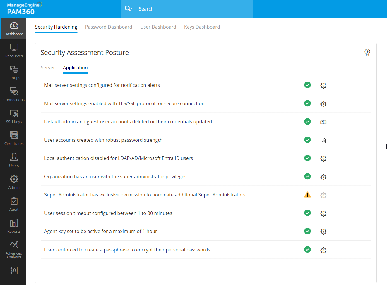 - Alert icon - The alert icon on the Server and Application postures indicates that the posture does not meet the recommended PAM360 practices. Click the gear or help manual icon beside the alert icon and perform the required actions to increase the security score and harden your PAM360 environment.