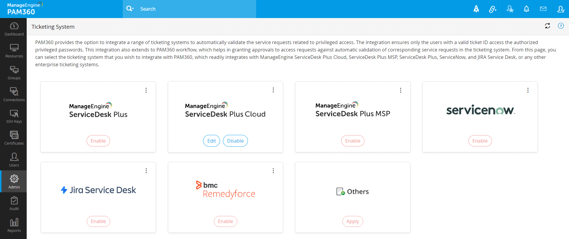 1. Log in to PAM360 and navigate to Admin >> Integrations >> Ticketing System.