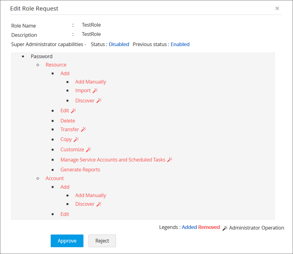 Operations accompanied by a magic wand icon indicate Administrator-level operations. If a custom role includes any of these wand-marked operations, it is treated akin to an Administrator role. You can create multiple custom roles with such operations, but the role only counts towards the license when assigned to a user in PAM360. For example, if your licensing permits 10 administrators and you assign a custom role with wand-marked operations to a user, it consumes one of the 10 allotted licenses.
