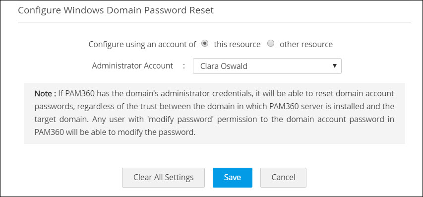 - Navigate to Resources >> Resource Actions against the WindowsDomain resource and select Configure password reset from the drop down.