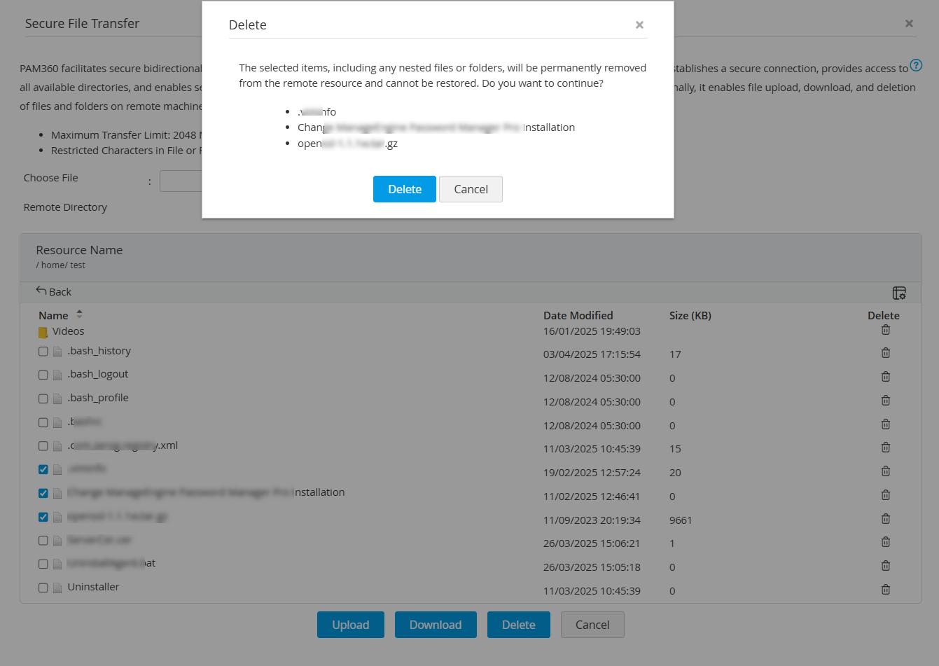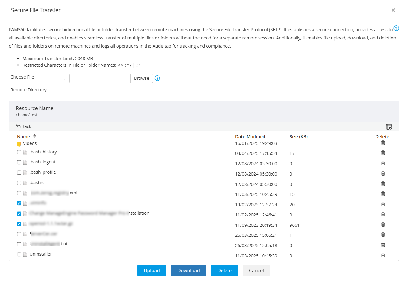 PAM360 supports secure file transfer between a user’s device and a remotely connected resource using the Secure File Transfer Protocol (SFTP). Users can upload or download files between their system and a remote resource in PAM360. In addition to that, users can establish direct SFTP connections between two remote resources added in PAM360 and perform bidirectional file transfer. During the transfer process, PAM360 establishes a secure and encrypted connection to the remote resources and lists all accessible directories, allowing users to transfer files without launching a separate remote session. This ensures authenticated connections and secure transfer of large files. PAM360 also allows users to delete files and folders within the remote directory during an SFTP session.