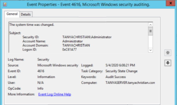 Event ID: 4616 describes an event where the system time was changed.