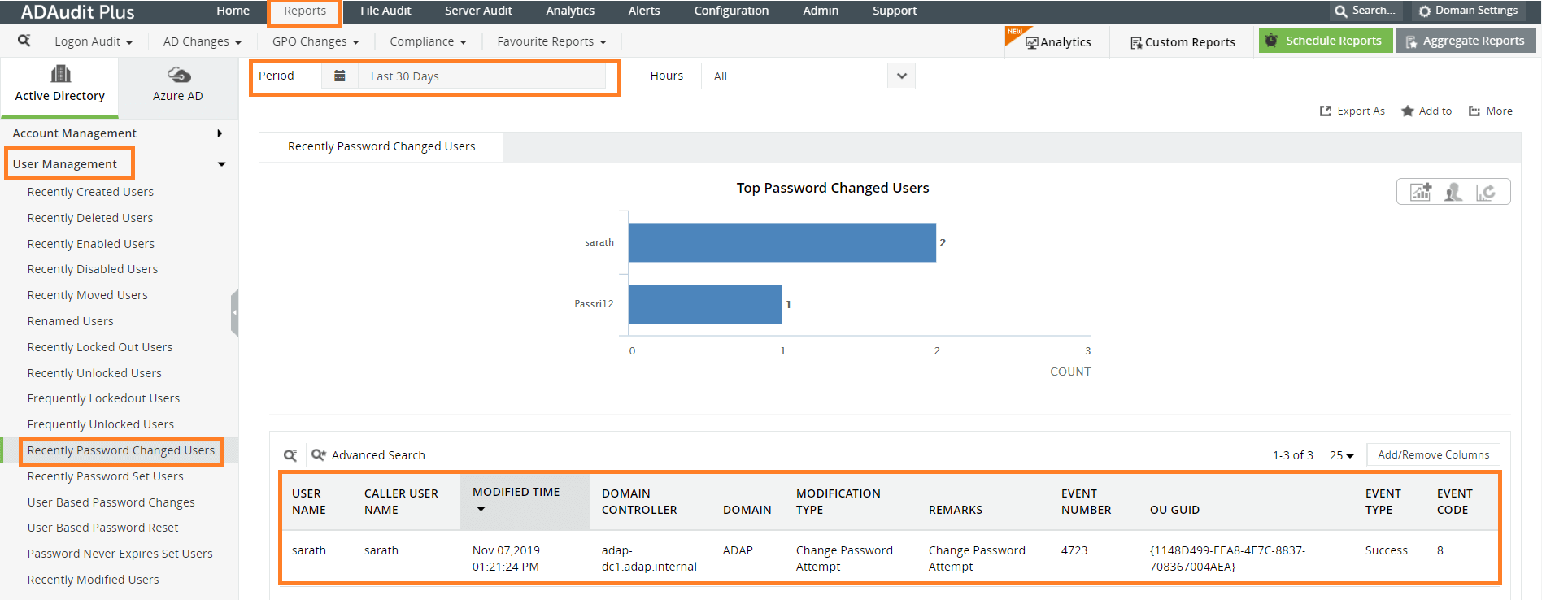 Under User Management Reports, navigate to the Recently Password Changed Users report.