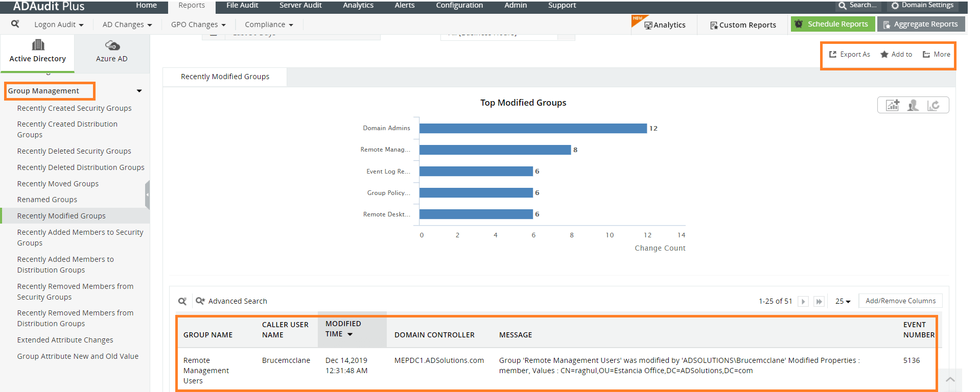 ADAudit Plus lets you view AD event logs in the form of neat, categorized reports. This way, you don't need to scroll endlessly through a jumble of security logs, spend hours filtering out events, or worry about events being overwritten due to limited storage. ADAudit Plus does all the work for you. Here is a sample report of group modification events.