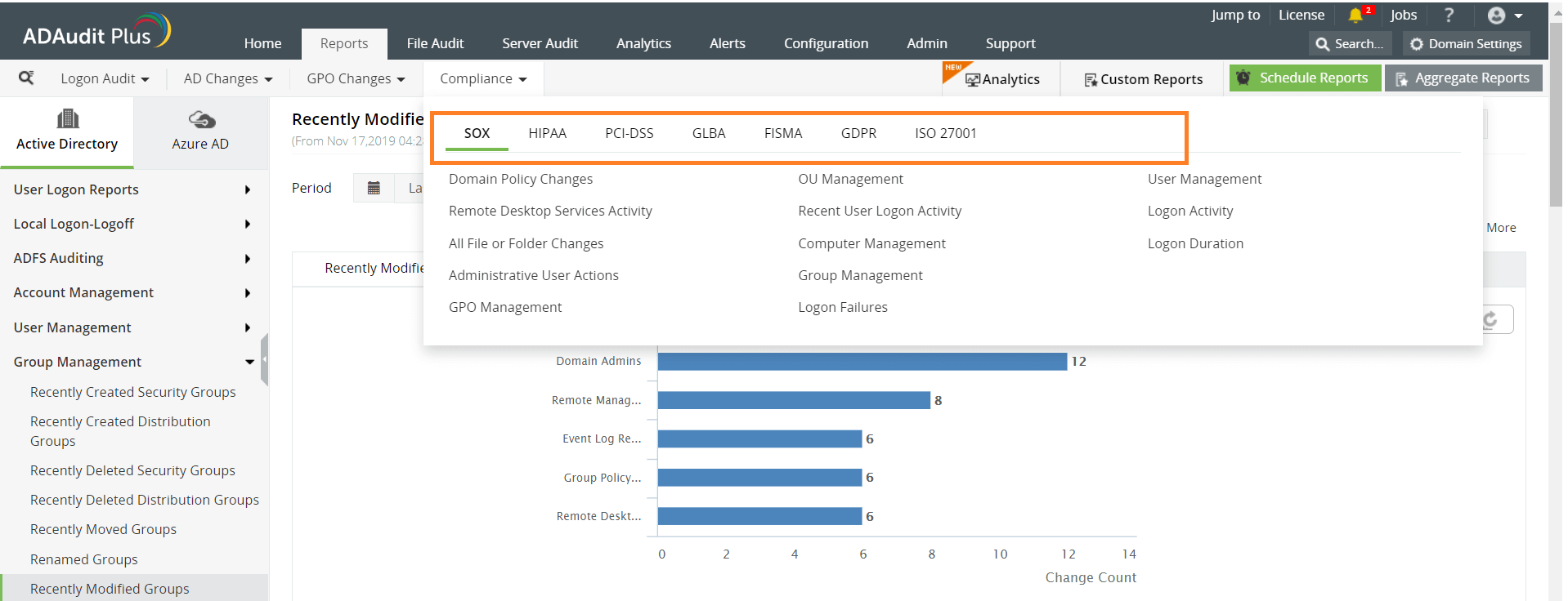 Your AD logs are also compiled into preconfigured compliance reports to help you satisfy industry regulations.