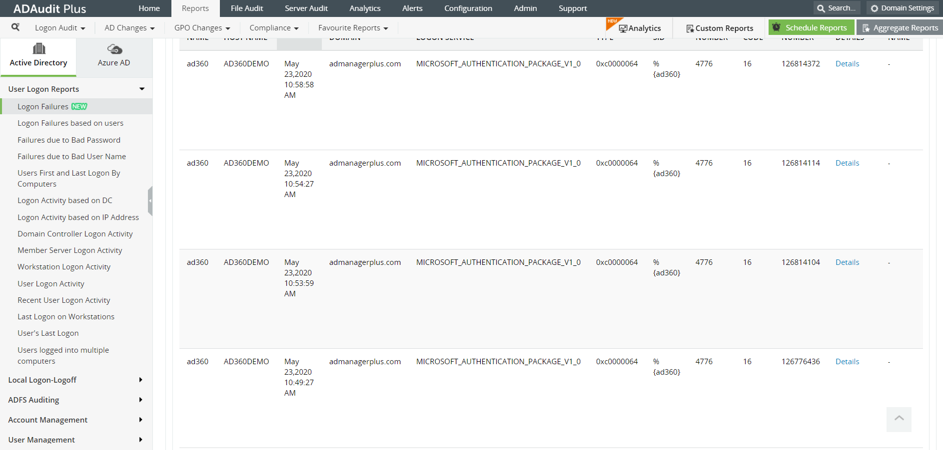 ADAudit Plus is a comprehensive Active Directory(AD) auditing and reporting solution . Its intuitive user interface, pre-configured reports, and advanced filter options make it easy for you to track logons and logoffs in your network efficiently. In the Logon activity, report, check out the 'Authentication Package' column to see which authentication protocol was followed to authenticate a user.
