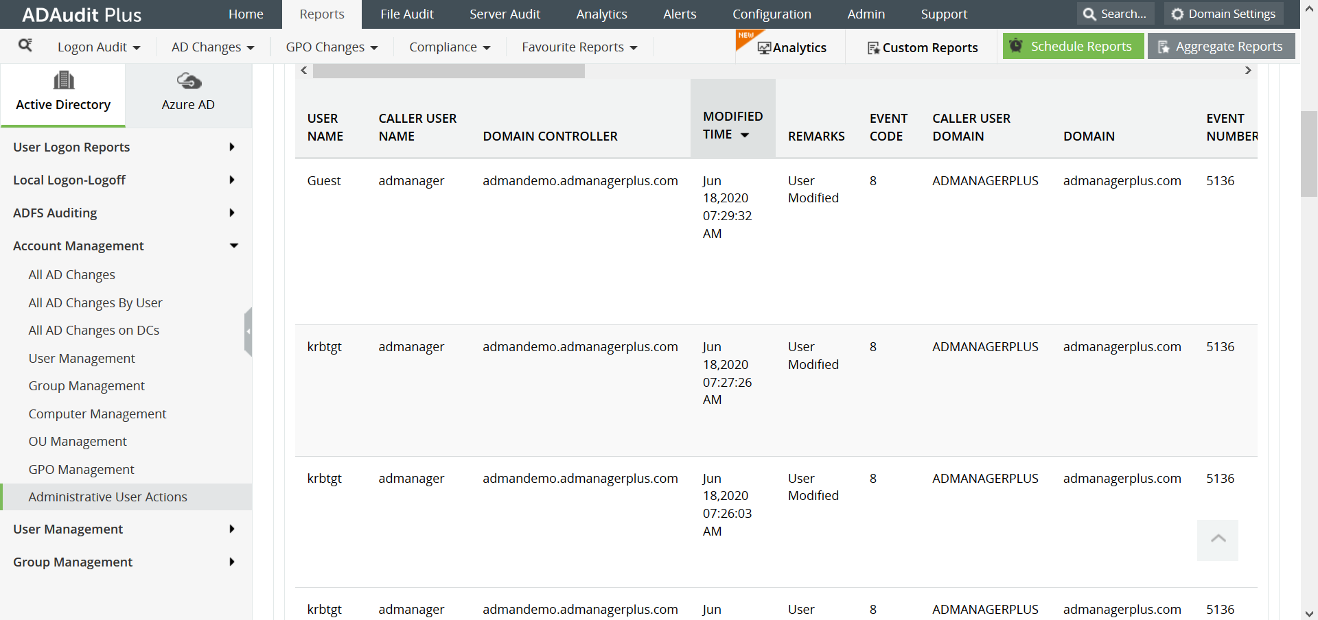 This report provides information on all the modifications performed by administrators, who are users with privileged access. It displays the name, timestamp, the domain name and a description of the modification event. This report can be accessed on ADAudit Plus by navigating to Reports > Account Management > Administrative User Actions.