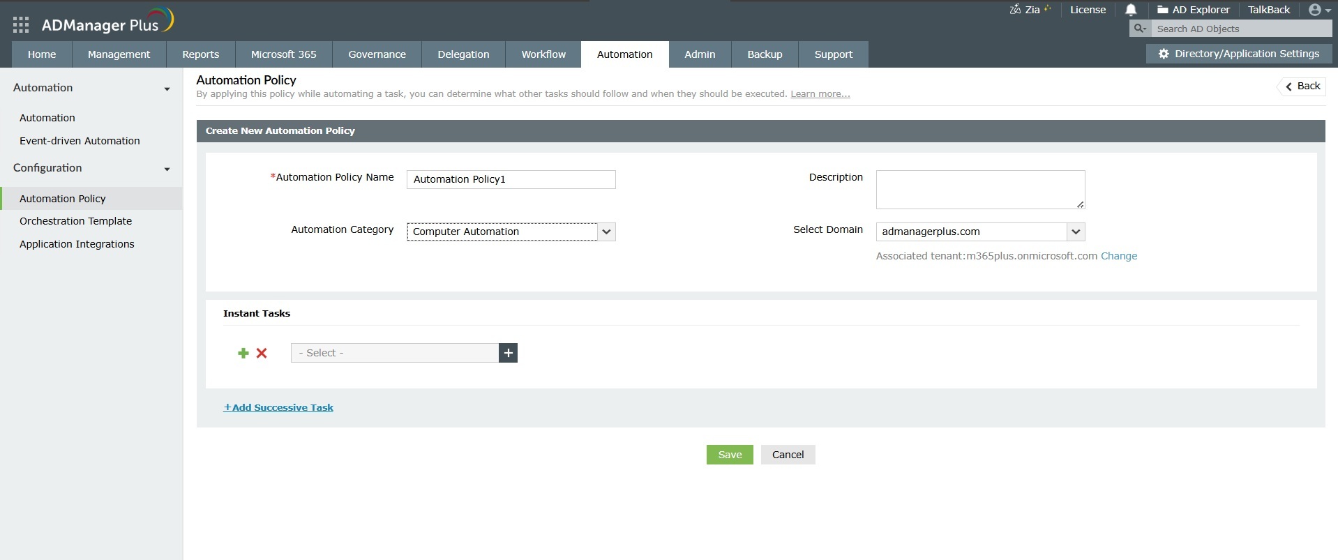 ADManager Plus "automation policies" allows you to configure follow up tasks for computer account actions.Say for example like in the above illustration you configured an automator that scouts for inactive users and disables it at the end of everymonth, but you also want to delete those disabled accounts after a certain period of time,Such scenarios can easily be handled by configuring automation policies.Take a look at the automation policy given below: