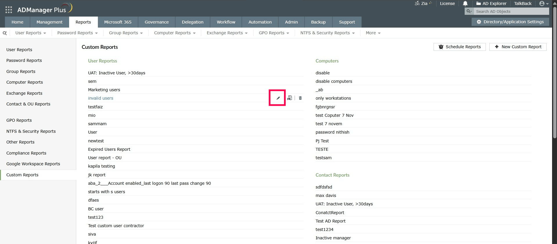 Edit existing criteria in a report to meet new requirements using the edit option available beside the report name, as shown in the figure below.