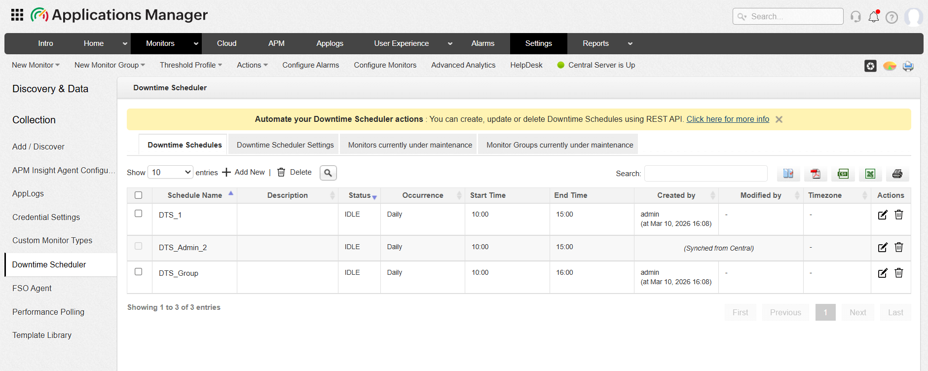 When a downtime schedule is created in the Central Server, it is automatically synchronized with the Probe Servers that contain monitors associated with that downtime.