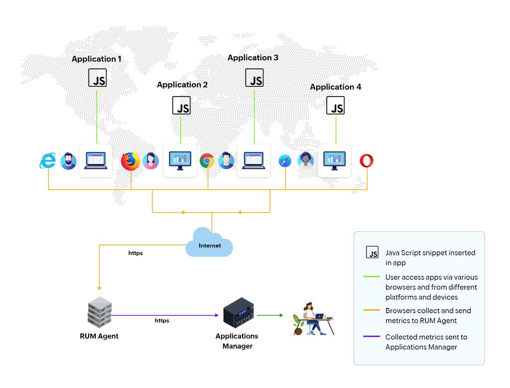 Users need to place a small JavaScript snippet generated by Applications Manager in the header or footer part of the HTML code of the web application that needs to be tracked. Upon loading, the web application interacts with the RUM agent and transmits the performance data constantly to the RUM agent, which is then captured and presented in the Applications Manager web client.