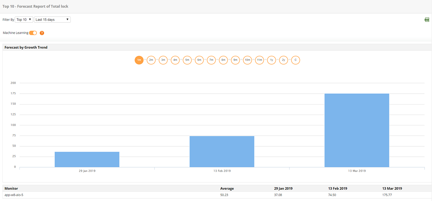 Exploit Applications Manager MongoDB monitor's reporting capabilities to analyze and understand the performance trends of MongoDB. With Applications Manager's reporting facility, visualize and track all the important metrics, and make informed decisions regarding your servers. Get historical reports of various attributes over a period of time and compare the reports of various databases. Applications Manager MongoDB performance monitoring software employs machine learning techniques to help forecast load and plan capacity of database servers. Trend analysis reports allows you to get insight into the performance trends of important attributes which aids in better planning and allocation of resources.