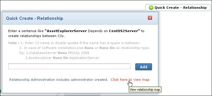 Say for example, enter a sentence like AssetExplorerServer Depends on CentOS2Server. Here, AssetExplorerServer forms the first piece of information, Depends on is the relationship type and CentOS2Server forms the dependent CI.