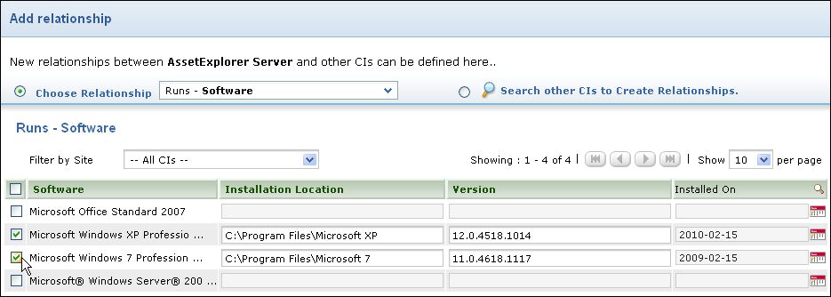 2. The default relationships configured for the CI Type "Server" is listed in the Choose Relationship drop-down. Select the relationship from the drop-down, say, "Runs - Software". The CIs under the CI Type "Software" are listed along with the configured relationship attributes.