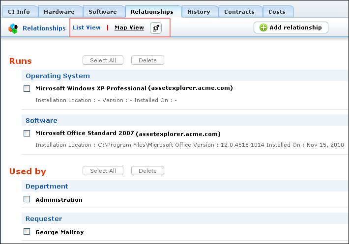 Every CI in ManageEngine AssetExplorer is represented with Attributes and Relationship. While the Attributes are data elements describing the CIs, the relationships help in understanding the interdependencies between the CIs. The relationships can be defined from the relationship tab.