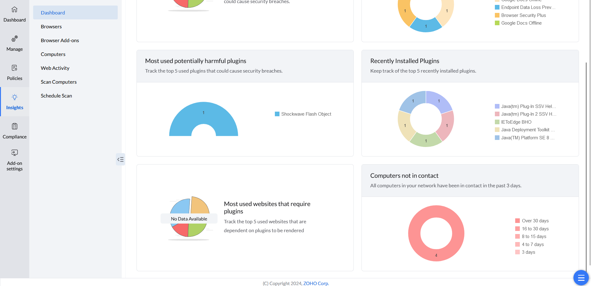 The Dashboard view under the Insights tab summarizes key browser security risks. It highlights most used harmful extensions and plugins, recently added ones, disconnected network computers, and most used websites needing plugins.