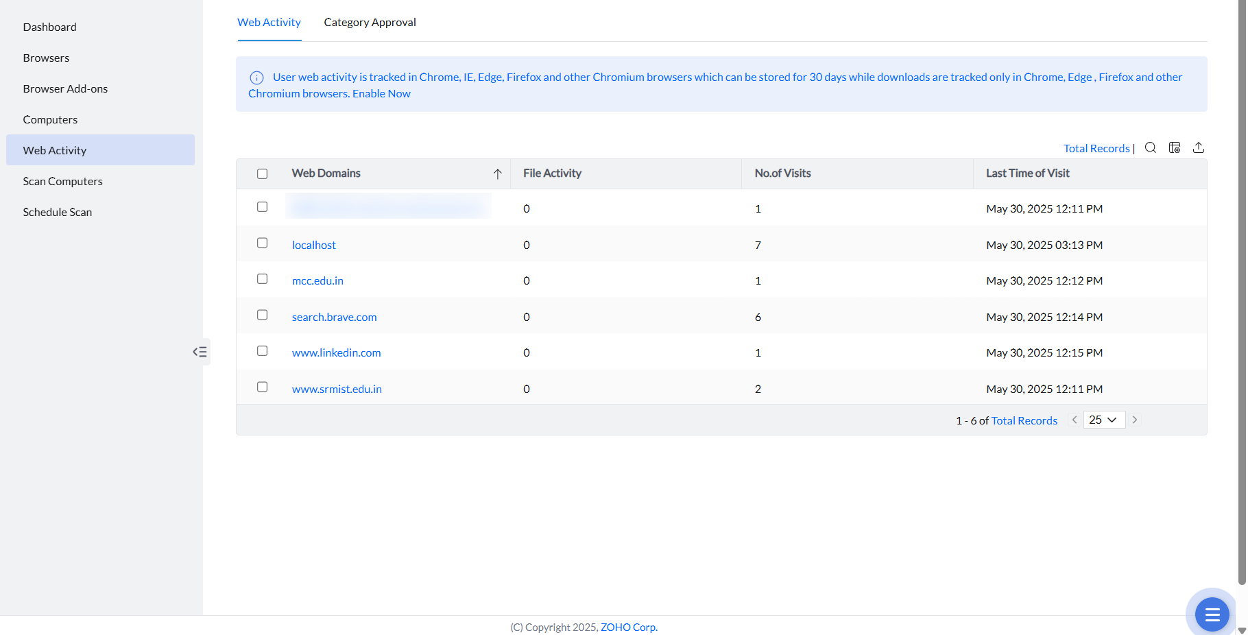 The Web Activity under Insights tab shows the web domains visited by the users, the file upload and download activities, and the time visited.