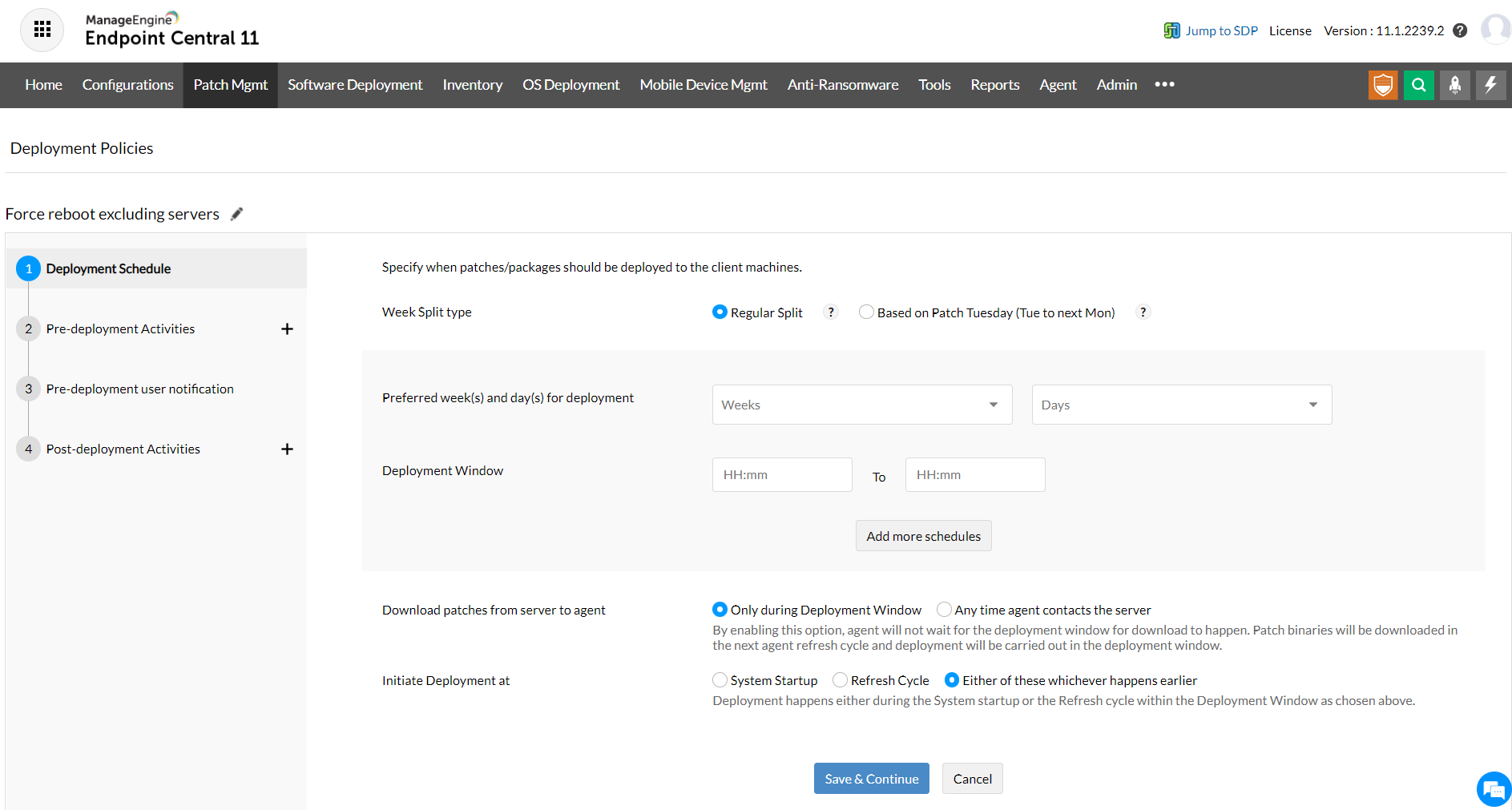 Each enterprise has its unique set of rules and regulations with a customized working pattern to gain maximum returns. The deployment of the patches might sometimes hinder the productivity of the systems due to high bandwidth consumption. To avoid this, the admin can customize the Deployment schedule.