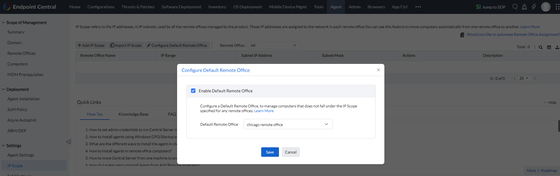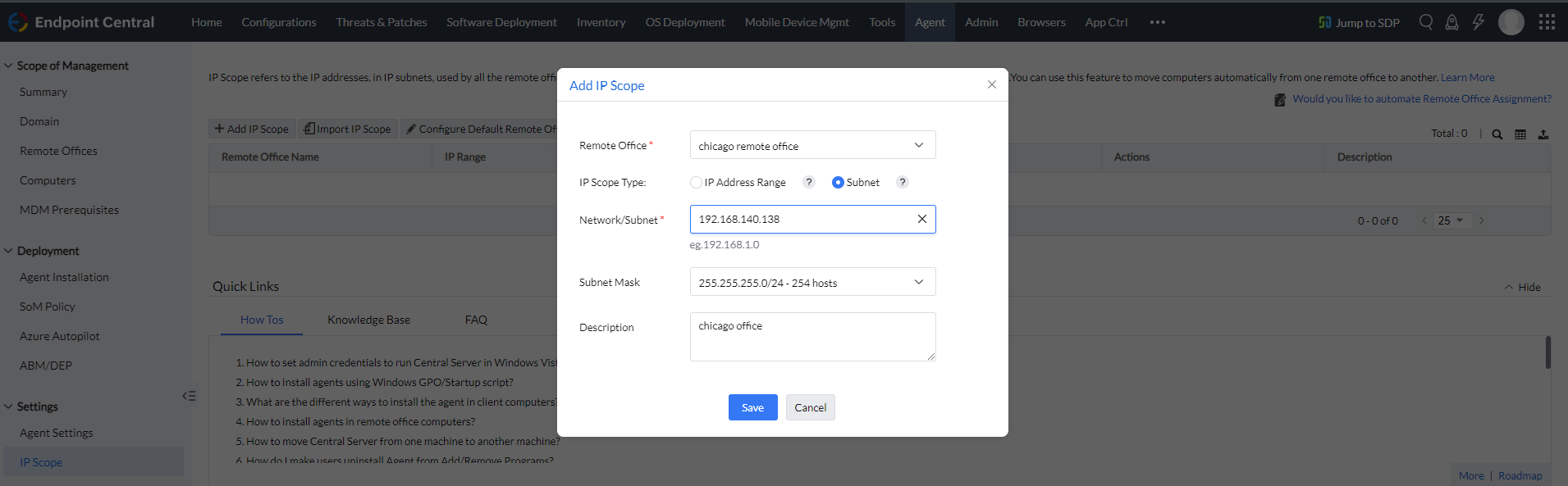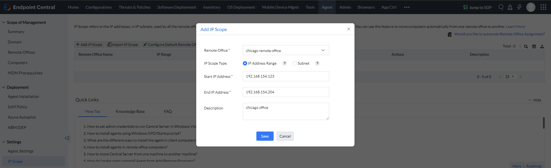 Different IP scopes for various remote offices can be defined. This way, whenever a device is moving from a local office to a remote location, a new IP address is automatically assigned to it by the DHCP server in the remote office network. On the next refresh policy, the agent determines whether the newly assigned IP address is within the IP range of the new remote office. When a change is detected, the respective device will be automatically associated with corresponding remote office based on the new IP. Follow the below steps to add an IP scope: