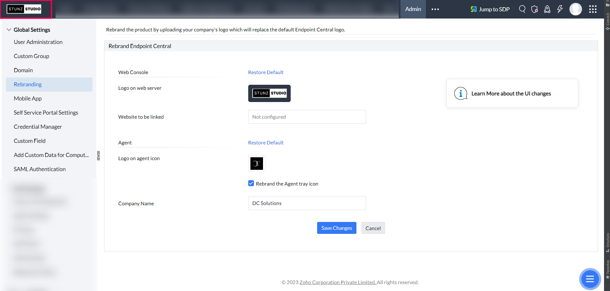 To rebrand, navigate to Agent > Global Settings > Rebranding and modify the logo and details on the page.