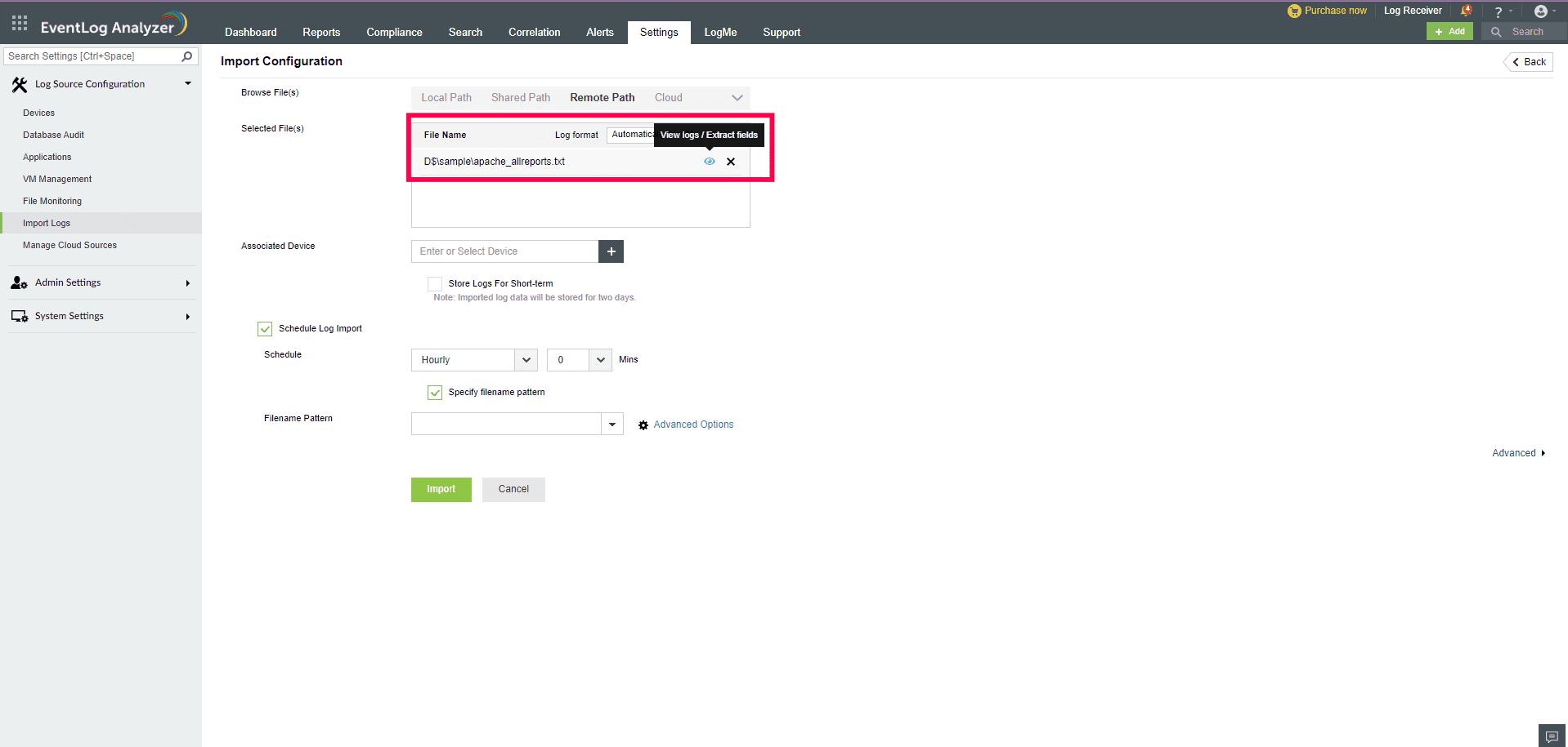 Importing the logs to EventLog Analyzer.
