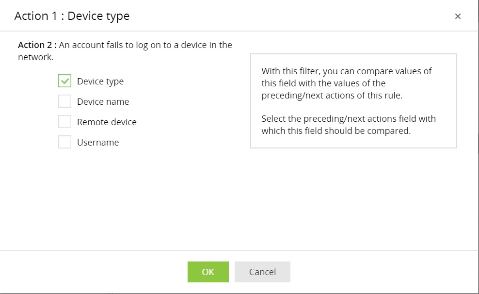 The link to comparison type is used to check the value of the selected field against the value of a field in another action (belonging to the same rule or the primary action of the other rule). For instance, if the field Device type of Action 1 is linked to Action 2's Device type value, then Action 1 would get triggered only if the value of both the linked fields are the same.