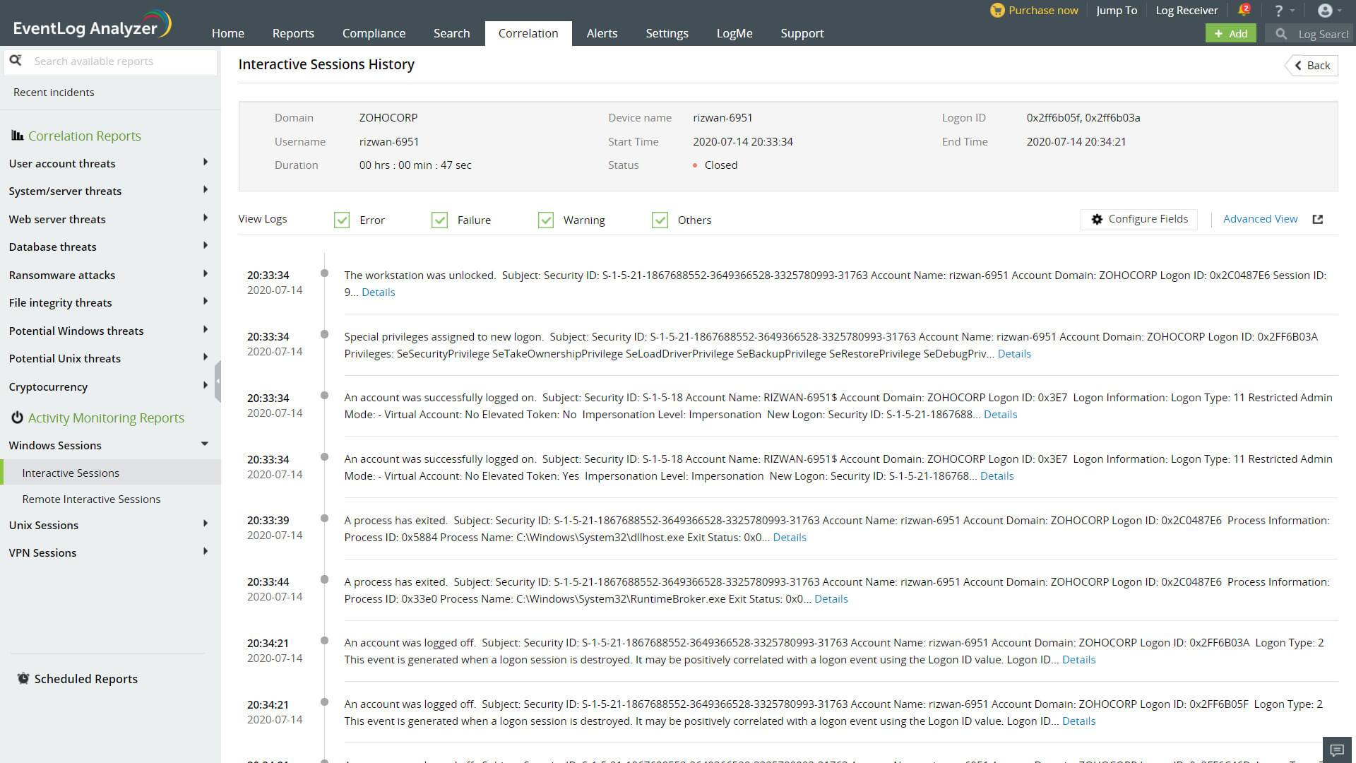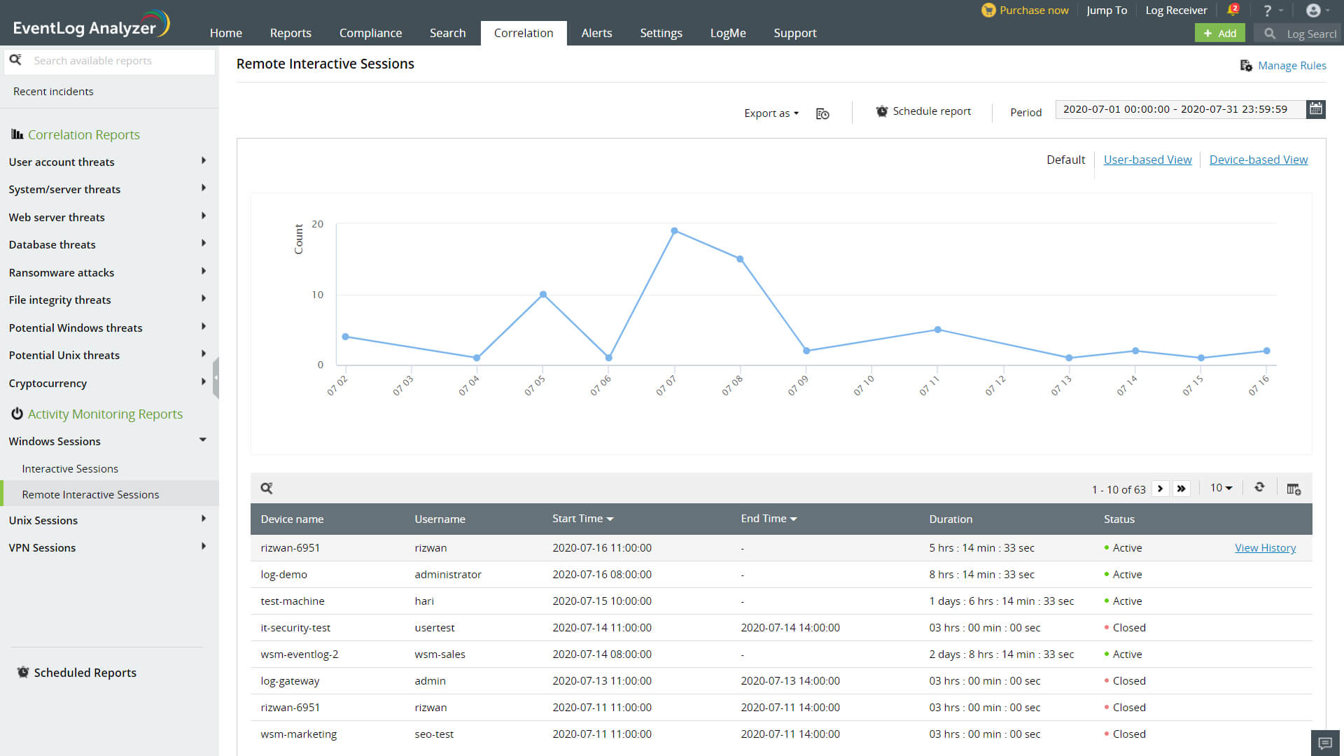 EventLog Analyzer processes log data across your network and provides reports on session activity of your network devices and users. You can access these reports by clicking on Activity Monitoring under the Correlation tab.