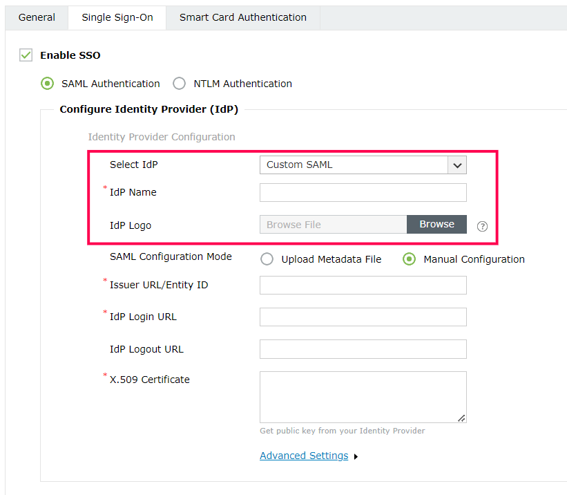 - If you want to use a custom SAML IdP, select Custom SAML from the Select IdP drop-down menu, and enter the name of the IdP in the IdP Name field.