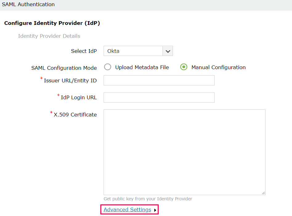 - There are two SAML Configuration Modes: Upload Metadata File and Manual