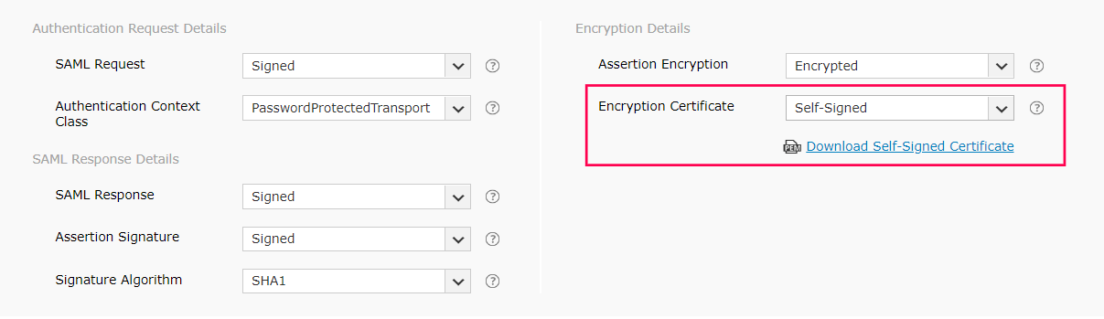- If the SAML assertion is encrypted, then select whether the Encryption Certificate is Self-Signed or CA-Signed from the drop-down options provided.
