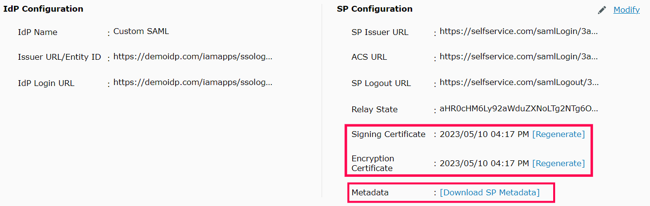 - To regenerate the SAML signing and self-signed encryption certificates, click on Regenerate button corresponding to the respective Signing