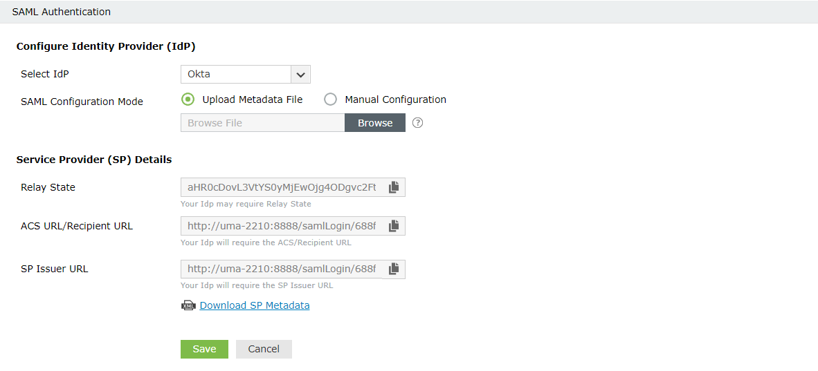 Metadata File. Use the newly generated ACS URL/Recipient URL or the SP Metadata File to create a new SAML configuration for ADSelfService Plus in your identity provider.