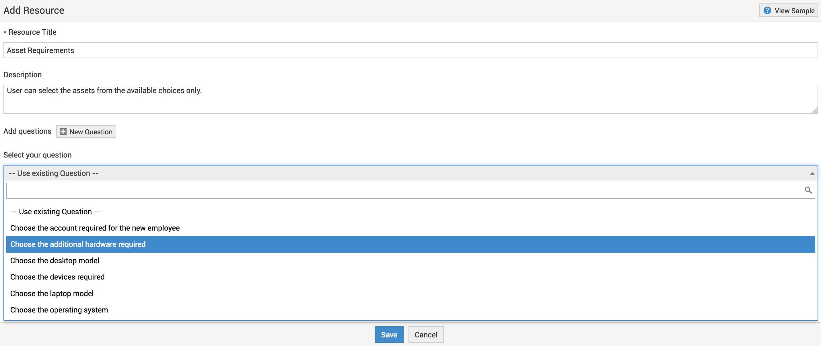 In this case the resource is "HP Pavilion" and click Add >> to make the resource available in the question. Click Ok to save the question. To add another question, click New Question and follow the process as above.