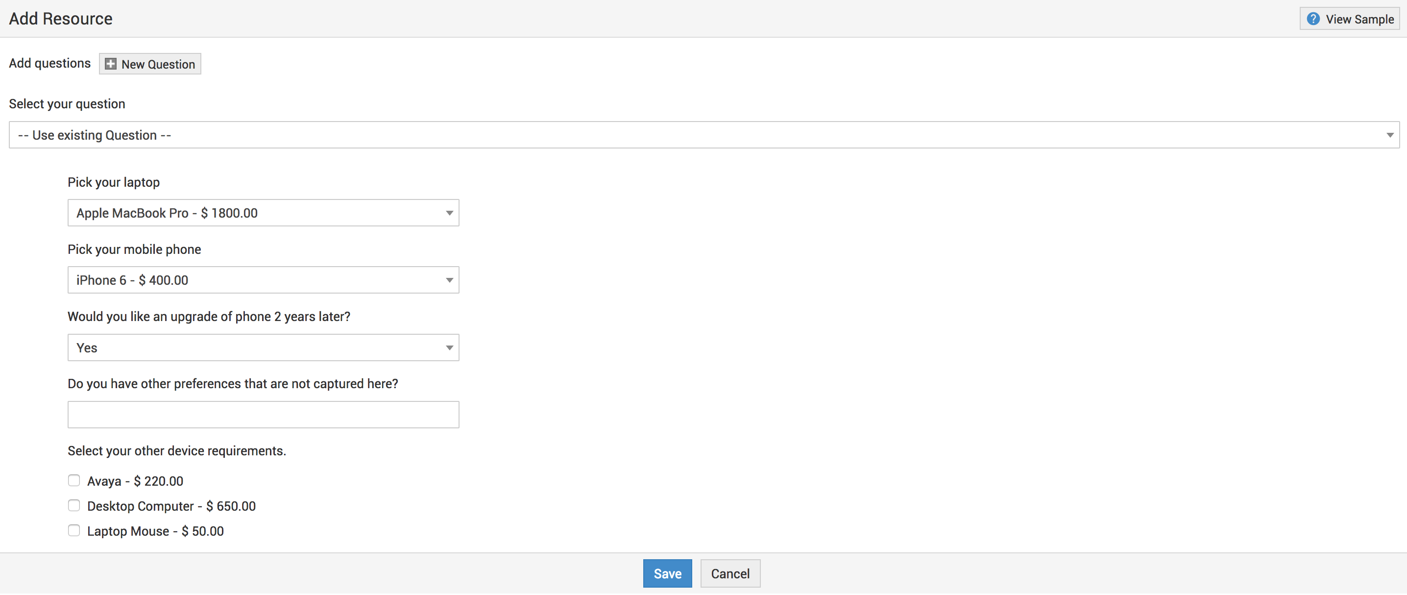 If the service involves any resources then you can mention them under the Resource Info block. The process of adding resources involves a series of questions, and the resources can be displayed in either of the following formats - check box, drop down, plain text or with simple yes/no. You can also add cost to individual options in resource questions.