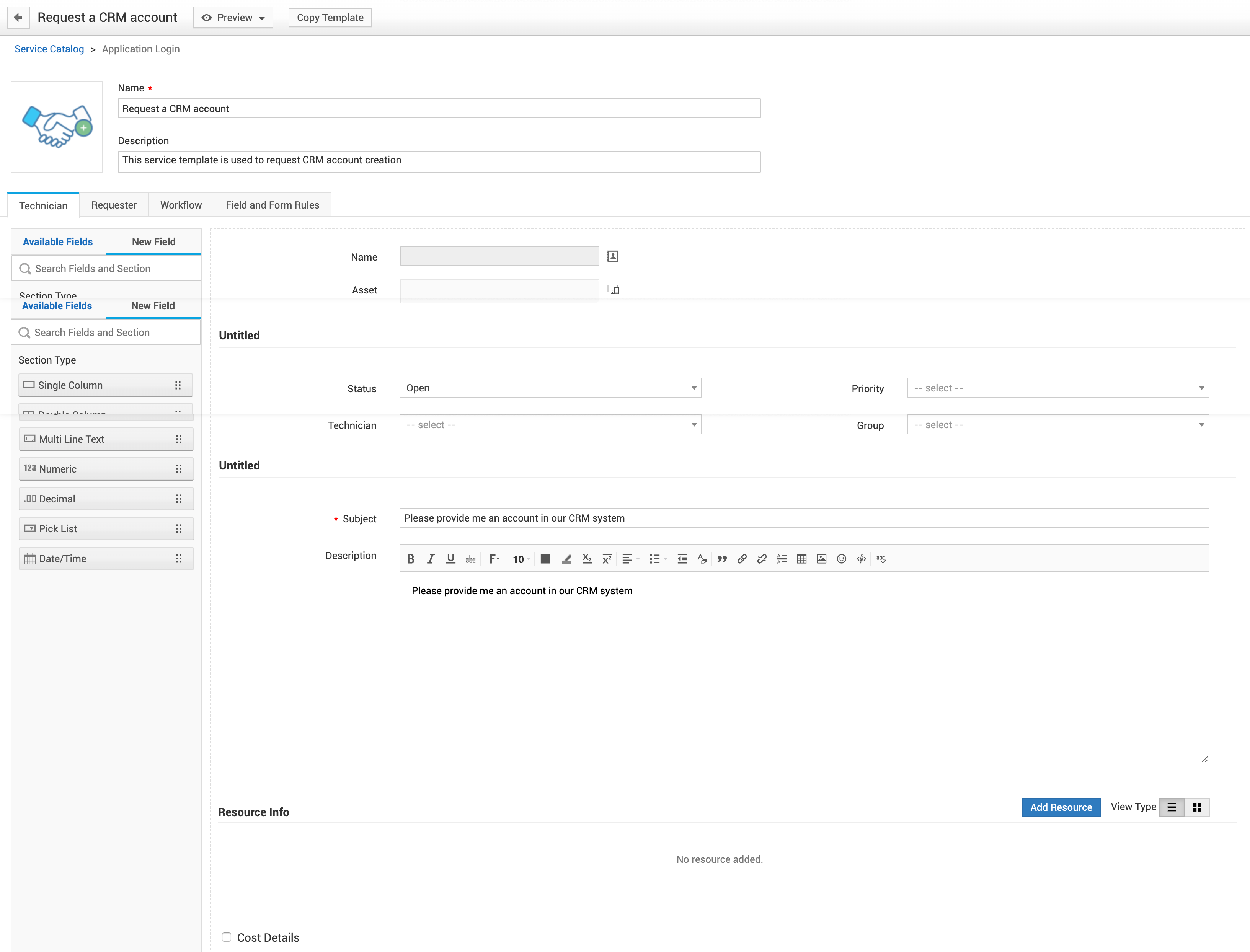 • Body: It consists of untiteled sections with default fields such as Status, Priority, Techician, Group, Subject, Description etc.