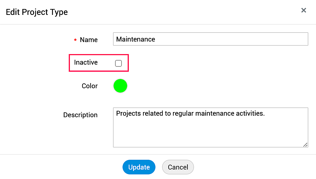 Reactivate Inactive Project Types - Edit an inactive project type and uncheck the Inactive box. Click Update to reactivate the project type. You can also select multiple inactive project types and click Mark as Active.