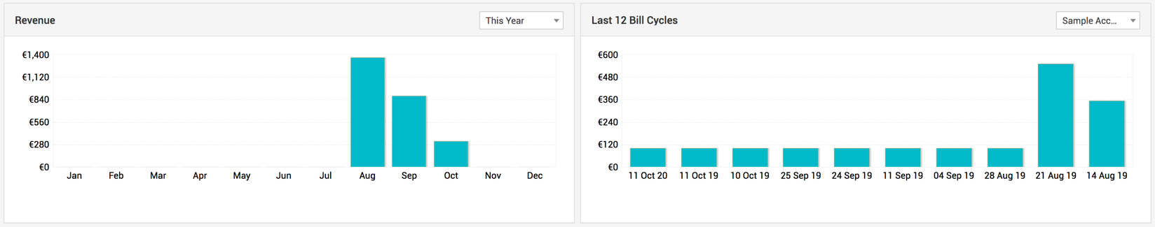 - Last 12 Bill Cycles: Revenue of the last 12 bill cycles. Use filters to view the bills generated for specific accounts and contracts.