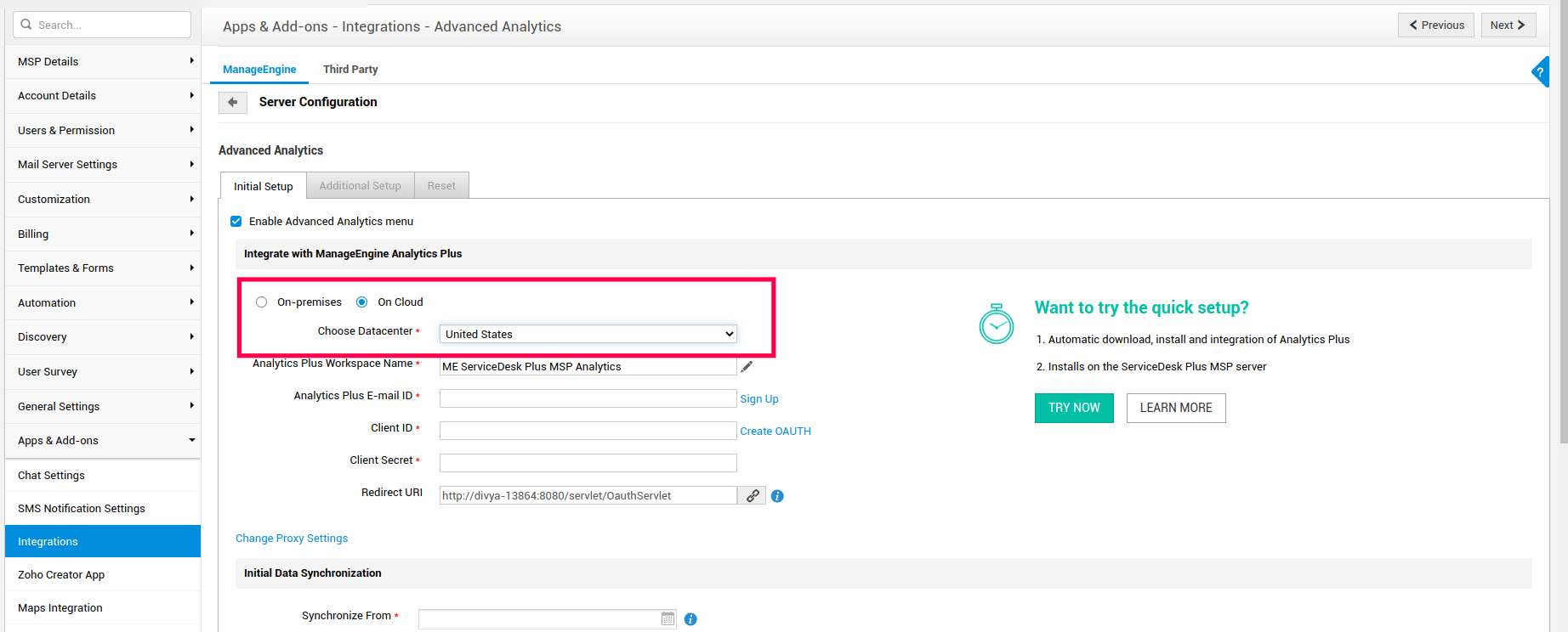 Configure Analytics Plus Cloud Integration in ServiceDesk Plus MSP