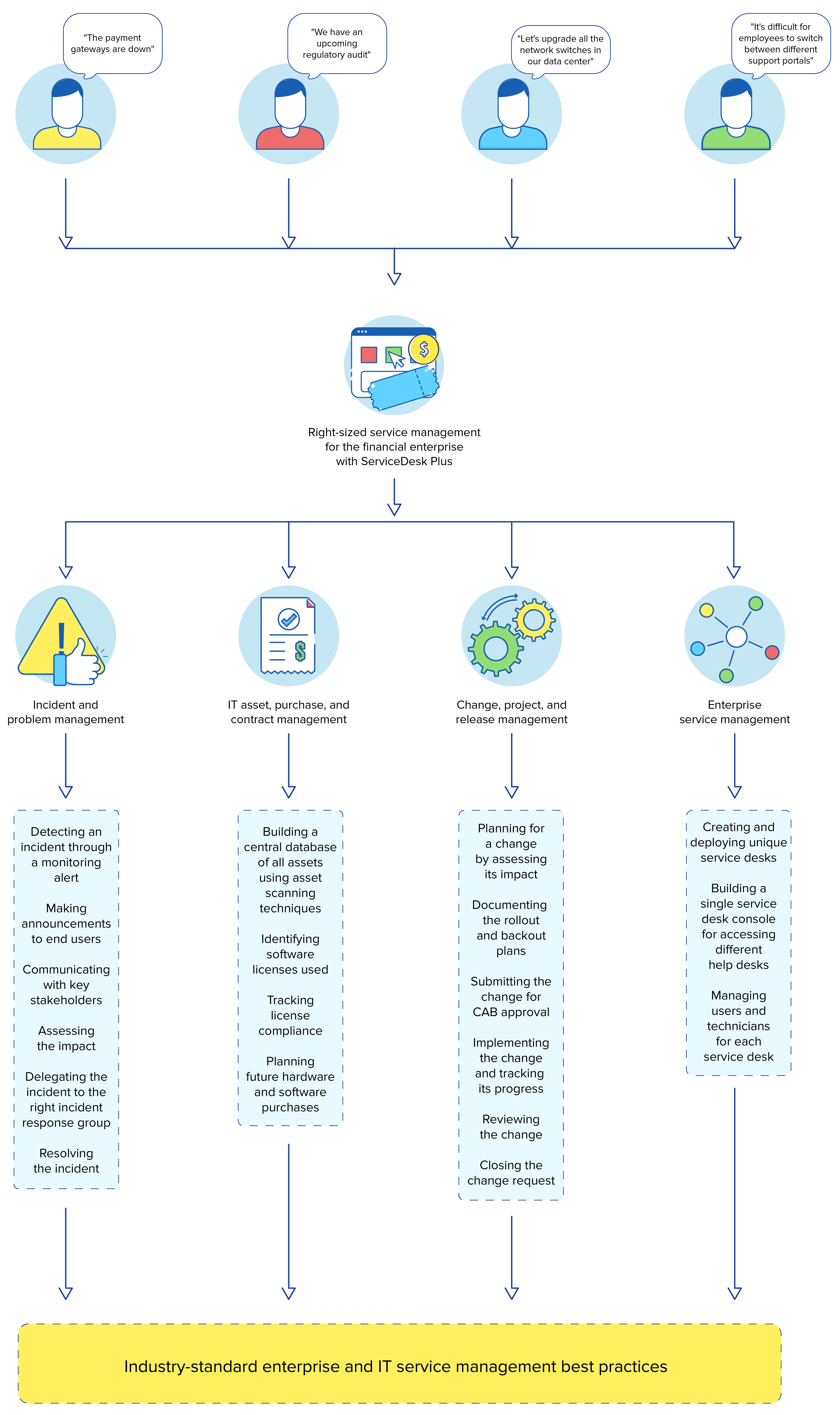Due to these factors, most banking and financial services institutions have a long way to go in their digital transformation journey, the success of which leans heavily on their IT departments. Furthermore, the challenges and disruptions brought on by the pandemic forced banks and other financial services institutions to be more agile and respond quickly to the pandemic-driven new normal. The combination of ongoing digital transformation and new ways of working means that IT departments need to prop up business-critical systems and deliver enterprise services to employees around the clock. Without an effective service management platform that aligns with industry-standard best practices, IT and enterprise departments in banks face an uphill battle in managing services and delivering a remarkable end-user experience.
