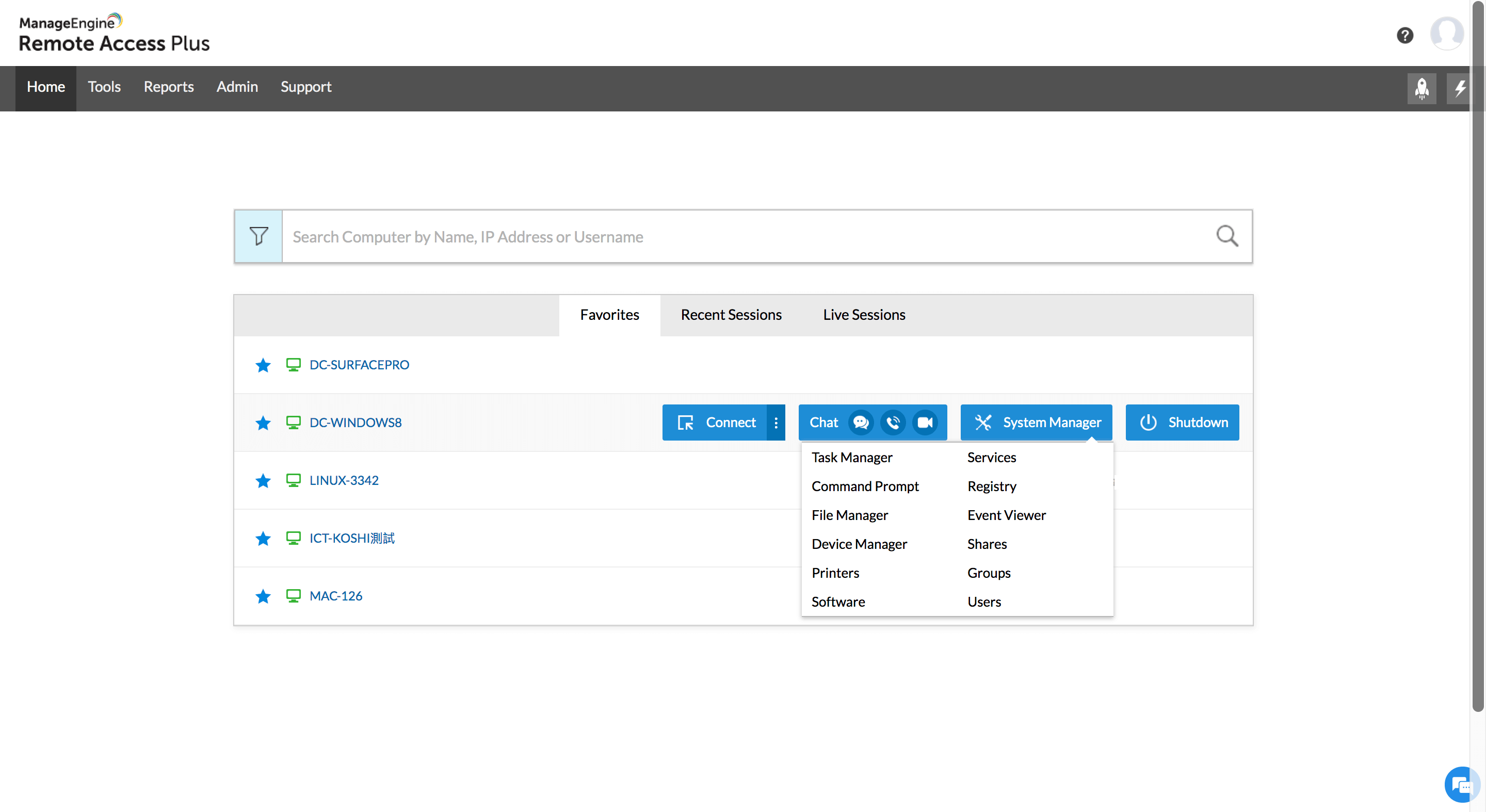 Initiating remote sessions for resolving issues might have a huge impact on end-users' productivity. Remote Access Plus comes packed with over 12 diagnostic tools including, Command prompt, Task Manager, Event Viewer, Registry, Device Manager, File Manager, and more to troubleshoot computers without initiating remote sessions.